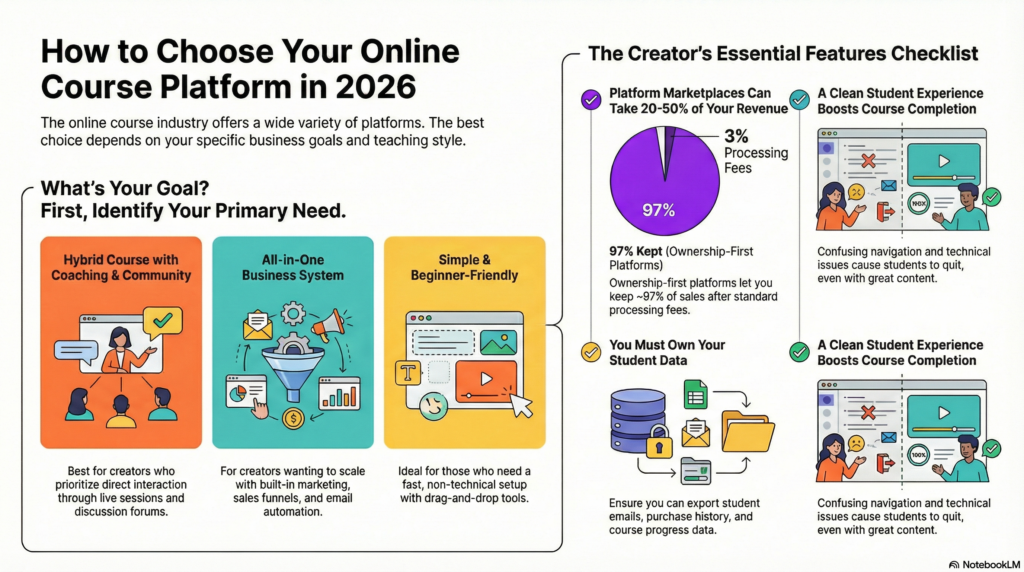 When choosing an online course platform in 2026, you will need to evaluate your business and teaching goals. Course creators should utilize platforms that effectively display their content and that they are proficient in using.