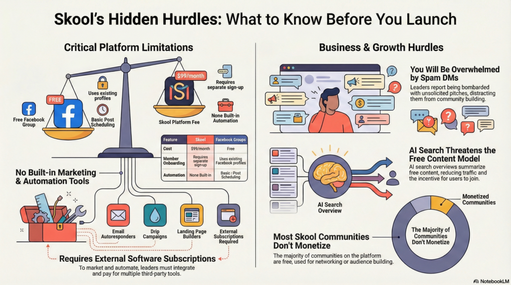 This article examines whether Skool truly delivers on its promises or if community builders are better served by alternative approaches. From the platform’s functional gaps compared to free options to the broken economics of membership sites in an AI-driven world, understanding these challenges helps leaders make informed decisions about where to invest their time and resources.