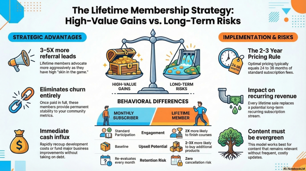 Offering lifetime memberships presents both significant advantages and potential pitfalls for membership site owners. Understanding these tradeoffs is crucial before implementing this pricing strategy into your business model.
